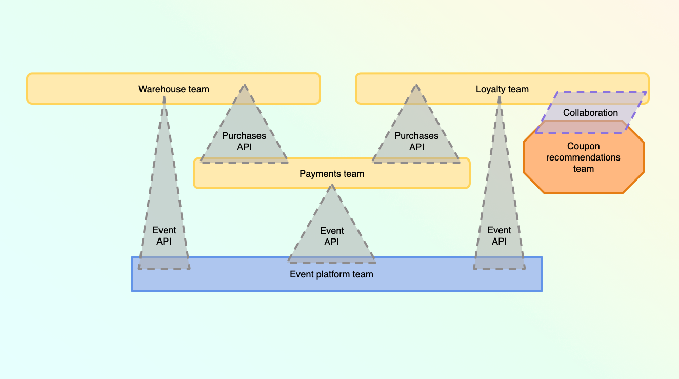 And as you continue to scale, you can add teams for more specific functionality, like one to maintain your event infrastructure, and another for developing machine learning capabilities for your loyalty program (Check out the Team Topologies website for more information on the design language I am using in these diagrams).
