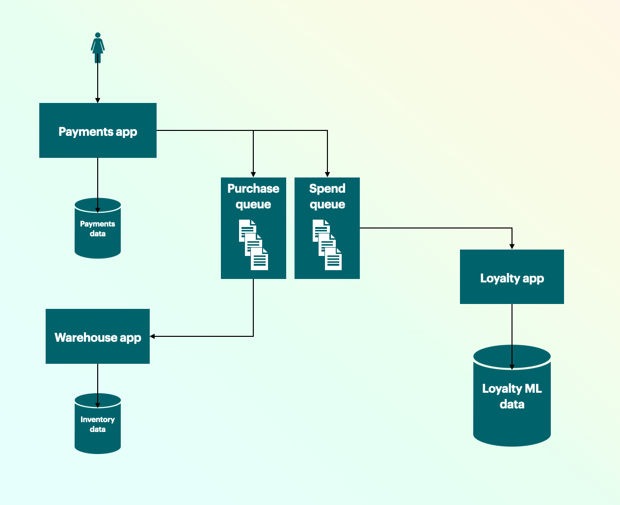 In the above example, you can see that it is important to the business that purchases process the payment immediately, but the warehouse inventory may not need to be updated until later, maybe each evening after closing. We also want to update their reward points after each purchase. The loyalty program does not need to otherwise understand language associated how payments processors or inventory management. That is why they exist in two different subdomains.