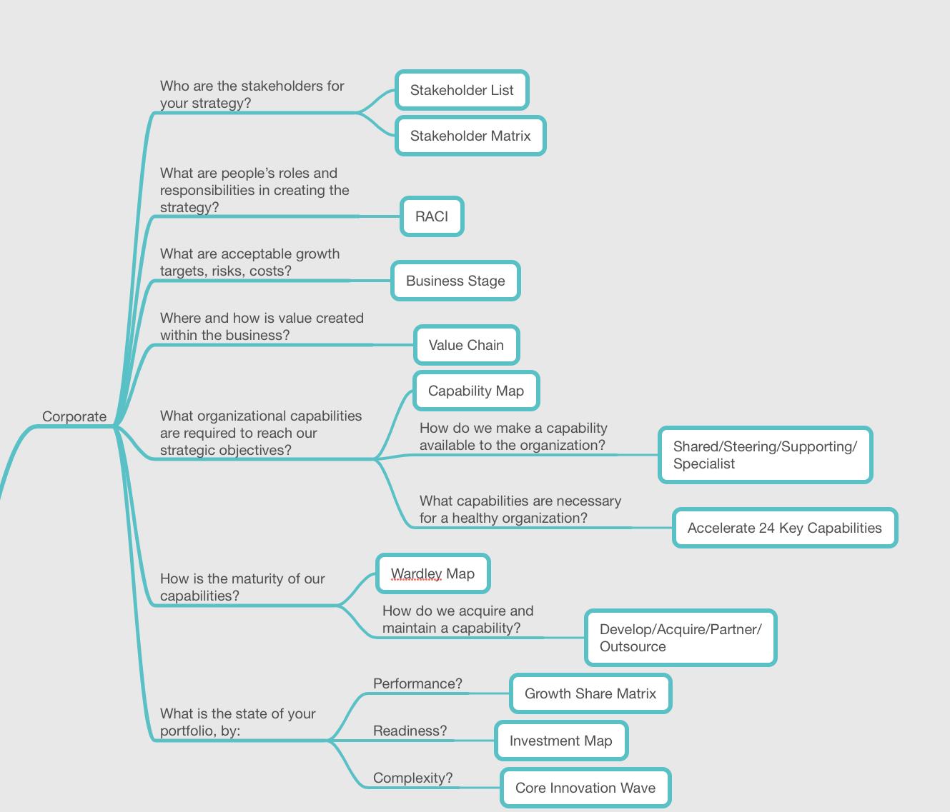 What about adding material from other books or people? Accelerate, which I mentioned above, focuses on capability models as a way to think strategically about your organization and as a means of transformation. I added a few questions in the Corporate" branch of the mind map to make space for these: